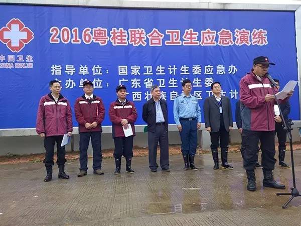 本次演練由粵桂兩省衛生計生委主任段宇飛和李國堅擔任指揮長,副主任陳祝生和梁遠擔任現場總指揮。現場模擬發生洪澇災害后引發各類次生災害,廣東省衛生計生委立即啟動應急預案,并根據粵桂兩省衛生應急合作協議,請求廣西自治區派出衛生應急隊伍聯合開展綜合衛生救援工作。