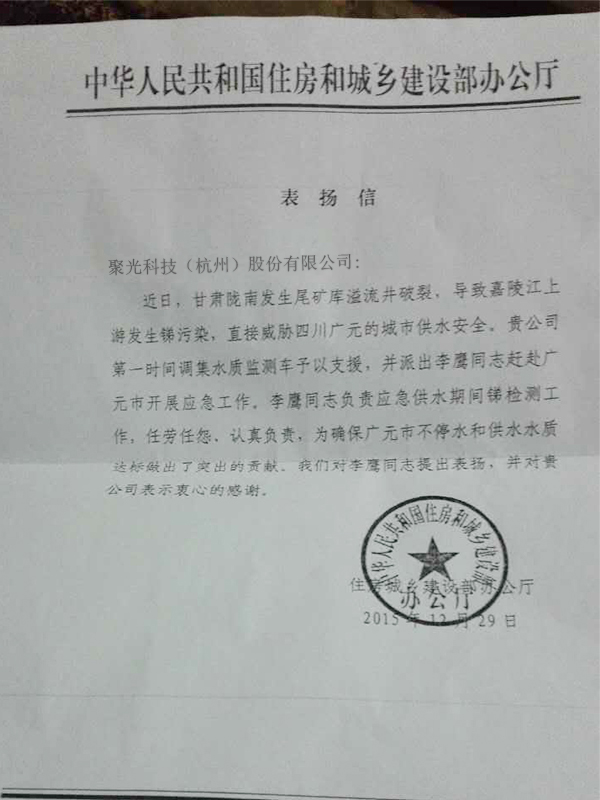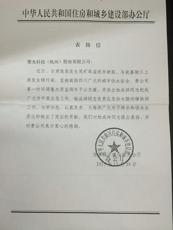 導讀:2015年11月底,甘肅隴南發(fa)(fa)生(sheng)尾礦庫(ku)溢流(liu)井破裂,導致嘉陵江上游發(fa)(fa)生(sheng)銻污染,直接威(wei)脅四(si)川(chuan)廣元的城市(shi)(shi)供水(shui)(shui)安全。聚(ju)(ju)光科(ke)技第一時間調集自主生(sheng)產的水(shui)(shui)質應急監測車給予支(zhi)援,并派數位技術(shu)骨干趕往廣元市(shi)(shi)開(kai)展應急工作,為確保廣元市(shi)(shi)不(bu)停水(shui)(shui)和(he)(he)供水(shui)(shui)水(shui)(shui)質達標做出(chu)了(le)突出(chu)的貢獻,中國住房和(he)(he)城鄉建(jian)設部辦公廳特(te)意發(fa)(fa)來(lai)表(biao)(biao)揚(yang)信,對此次支(zhi)援事件中的幾(ji)位技術(shu)人員給予了(le)充(chong)分(fen)的肯(ken)定和(he)(he)表(biao)(biao)揚(yang),對聚(ju)(ju)光科(ke)技表(biao)(biao)示了(le)衷(zhong)心(xin)的感謝。