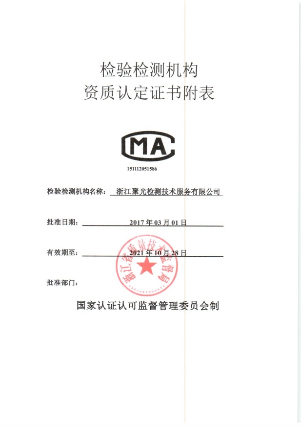 浙江聚光檢測于2012年獲得CMA資質,于2015年延續資質,并不斷擴充CMA認證檢測項目,擴增至1800余項指標,涉及水和廢水、環境空氣和廢氣、土壤、底泥、沉積物、固體廢物、噪聲、振動等領域。今年更延伸了認證領域,通過了移動實驗室的認證,充分說明了浙江聚光檢測實驗室的檢測能力。