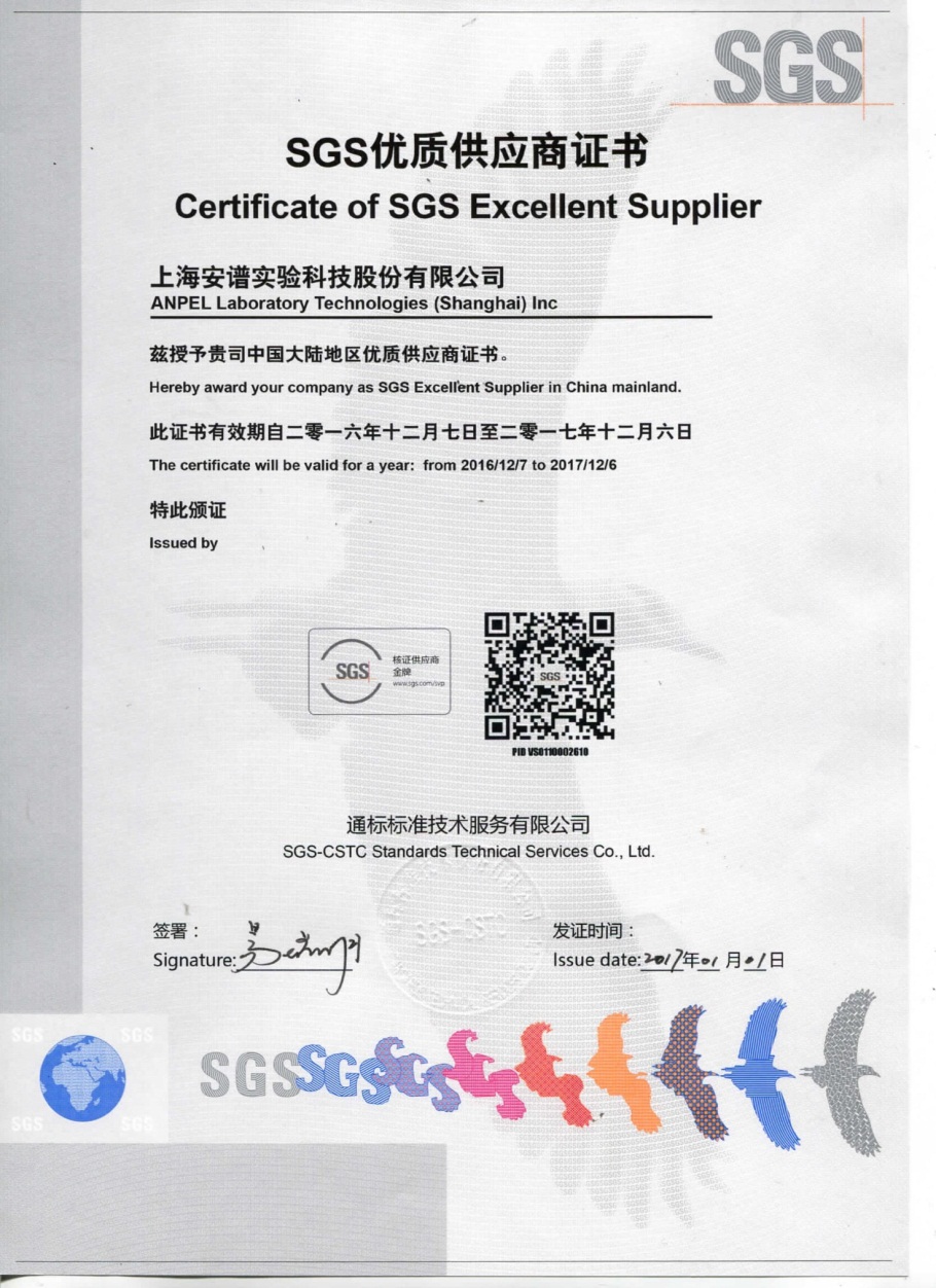 在2016年SGS供應商評選中,安譜實驗憑借雄厚的研發實力、專業的技術水平、完善的服務標準,贏得SGS的認可與信賴,榮獲“SGS優質供應商證書”。