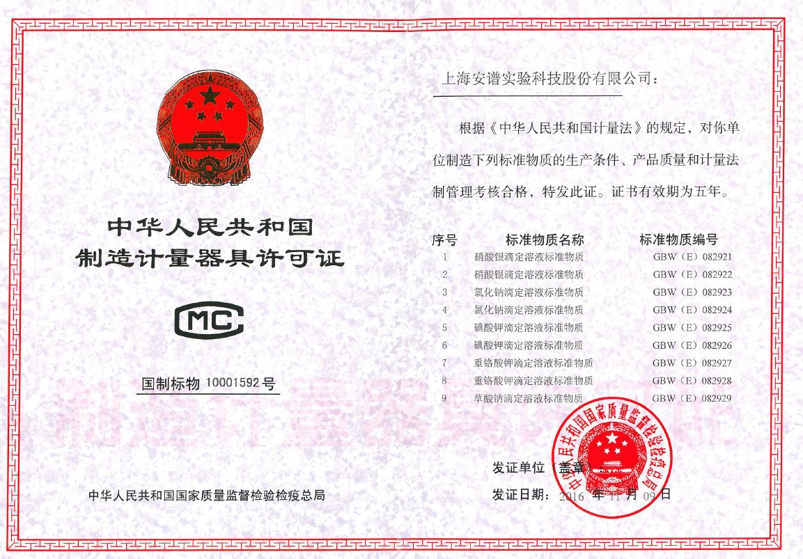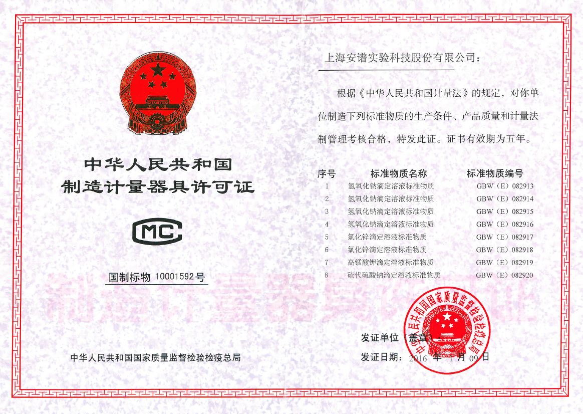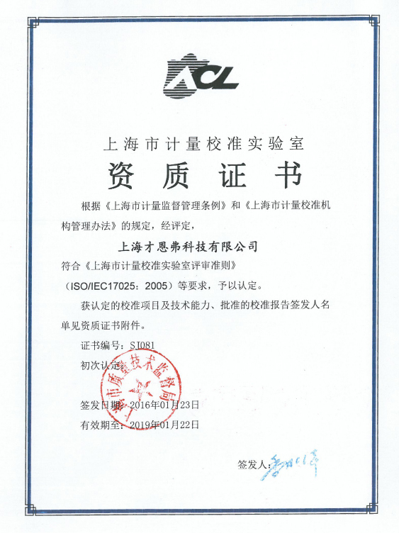 根據《上海市計量監督管理條例》和《上海市計量校準機構管理辦法》的規定,經上海市質量技術監督局評定,安譜實驗全資子公司上海才恩弗科技有限公司符合《上海市計量校準實驗室評審準則》(ISO/IEC17025:2005)要求,于2016年1月23日獲得上海市計量校準實驗室資質認定證書,證書編號為 SJ081;獲認定的校準項目為常用玻璃量器和移液器。通過此項認證后,安譜實驗開展計量業務,提供一站式計量產品和服務。