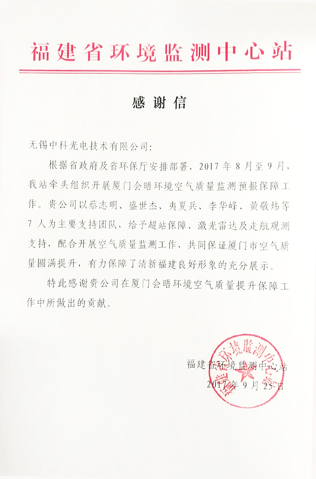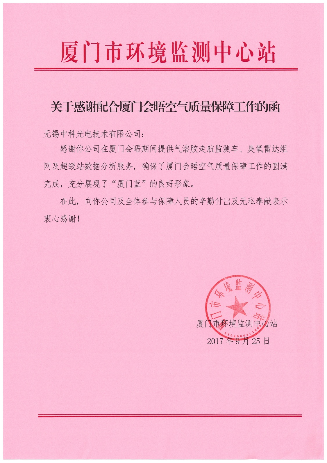 廈門市環境監測中心站感謝信