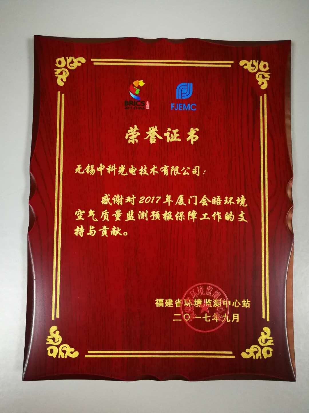 會議結束后,福建省環境監測中心站高度評價了中科光電的空氣質量保障隊,認為中科光電的空氣質量保障隊在開展空氣質量監測工作中,確保了廈門市空氣質量的圓滿提升,使清新福建的良好形象得到了充分展示,并頒發榮譽證書,對中科光電的勞動成果給予了非常的肯定。