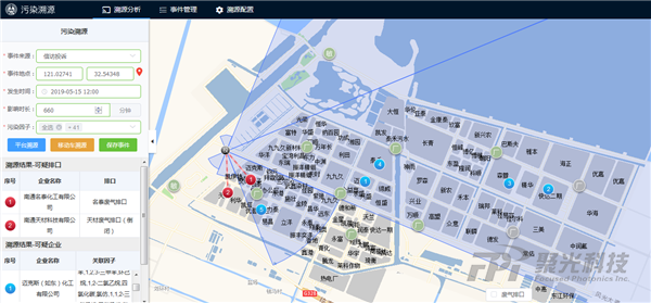 (三)溯源排查。當某一站點或某一地區出現超標或投訴時,可觸發平臺端大氣污染溯源系統對園區企業及站點的監測數據進行先進的數據分析,得出可疑企業名單。管理人員可對可疑名單進行現場確認與排查,最終鎖定污染來源,要求企業治理整改,形成問題閉環。