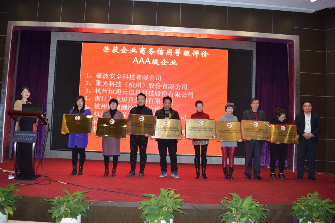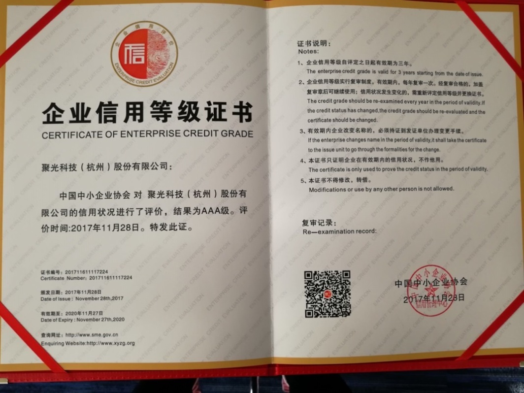 2018年1月12日,由中國中小企業協會舉辦的國家商務信用企業授牌儀式在杭州大廈百言堂召開,聚光科技(杭州)股份有限公司榮獲“企業信用評價AAA級信用企業”的榮譽。