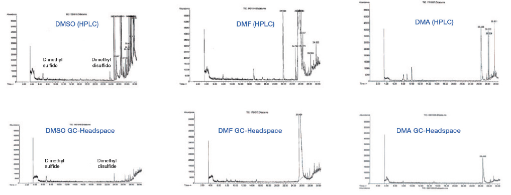 下面是HPLC 級DMSO、DMF、DMA 與HS-GC(氣相頂空)級DMSO、DMF、DMA 進行HS-GC-MS 分析譜圖對比: