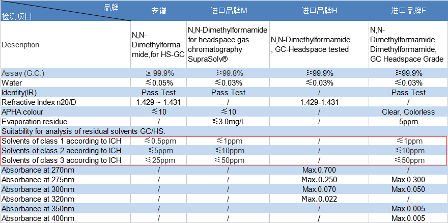 對比結果:安譜實驗頂空溶劑(Class1,2,3)殘留溶劑含量均小于其他競爭品牌