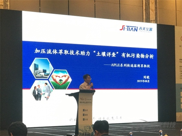 吉天儀器研發中心產品經理劉曉的報告主題是《加壓流體萃取技術助力“土壤詳查”有機污染物分析》。報告以“土壤詳查”為例,列舉了吉天APLE系列快速溶劑萃取儀在有機污染物分析方面的最新應用。劉經理提到,APLE系列快速溶劑萃取儀在整個萃取過程采用自動化完全密閉式處理,有效減少了有機溶劑的揮發以及工作者接觸有機溶劑的時間,綠色環保,健康安全。除土壤外,APLE系列也可應用于食品、聚合物、藥品等固體和半固體樣品中的有機物分析。