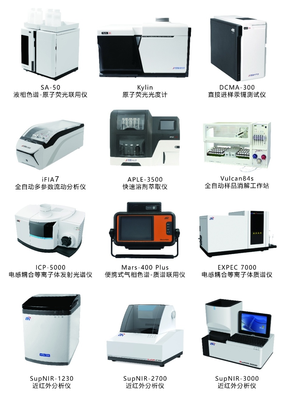 吉天儀器現有產品主要包括:原子熒光光度計、直接進樣汞鎘測試儀、原子熒光形態分析儀、流動注射分析儀、全自動鹵素測定儀、快速溶劑萃取儀、全自動固相萃取儀、電感耦合等離子體發射光譜儀、電感耦合等離子體質譜儀、近紅外分析儀、便攜式氣質聯用儀、全自動樣品消解工作站等。