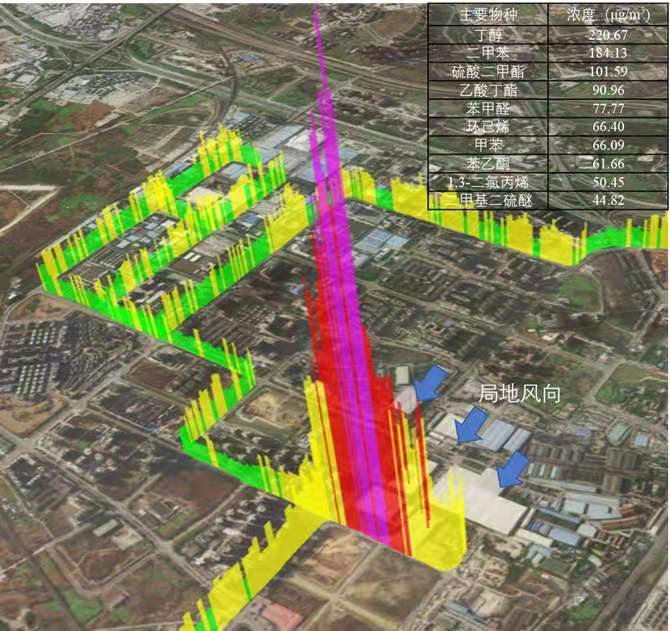 會議開始前期,聚光科技TOF-MS移動監測走航車早早到達會場,對成都城區及污染敏感點周圍整體環境進行為期一天的VOCs走航觀測,全局把控VOCs濃度分布全貌,對捕捉到的污染事件進行重點分析。在對臭氧前體物VOCs進行污染溯源時,發現某站點周邊存在一個明顯的污染高值點,通過局地風向與VOCs組分分析,對污染來源進行精準定位。