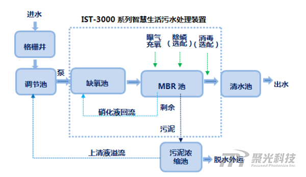 工藝流程說明: 園區污水經格柵過濾后匯集到調節池,調節池主要起水量調節、水質均衡的作用。調節池中的污水經提升泵輸送進入IST-3000系列智慧生活污水處理裝置的缺氧池。在缺氧池中,反硝化菌利用污水中的有機物作碳源,將回流硝化液中帶入的大量NO3-N和NO2-N還原為N2并釋放至空氣中,因此BOD5濃度持續下降,TN得以去除。