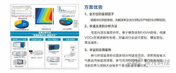 針對目前備受關注的O3污染問題,聚光科技推出了大氣光化學污染在線監測解決方案,通過構建監測網,配套在線光化學前體物,光解速率和特征產物等核心監測設備,對臭氧污染進行全面監測,結合數據分析平臺,對區域和本地貢獻進行識別、臭氧污染控制區判定和VOCs來源解析,實現O3和VOCs的精細化管控和空氣質量的持續改善。該方案和產品曾應用于環境監測總站國家組分網建設項目,承擔海南省大氣復合污染監測項目,并參與杭州G20峰會、廈門金磚會議和烏鎮世界互聯網大會等多個重大會議會議保障任務。