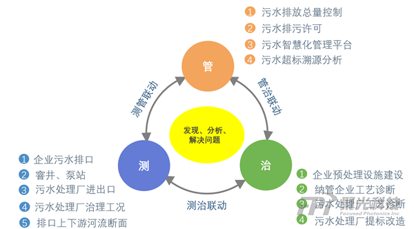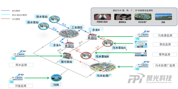 針對園區水污染防治工作中遇到的難題,聚光科技提出“源、網、廠、河”四級聯動監管體系,運用監測、監管、大數據算法等手段對水污染源從產生到流入自然水體的每個環節進行監測、監管、調度及調節,以實現水環境的閉環管理。