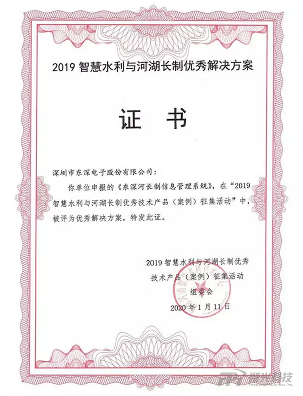 作為聚光科(ke)技智慧水利水務版塊重要成員深(shen)圳市(shi)東深(shen)電(dian)子股份有限(xian)公(gong)司(以下簡稱:東深(shen)電(dian)子)于2020年1月11日在“智慧水利與河湖長(chang)制(zhi)高峰論壇暨2019智慧水利分會(hui)年會(hui)”上,被(bei)授予(yu)“全國優秀(xiu)河(湖)長(chang)制(zhi)管理信息(xi)系統軟件測評”優秀(xiu)榮譽證書。同時,榮獲“2019智慧水利與河湖長(chang)制(zhi)優秀(xiu)解決(jue)方案(an)”獎。