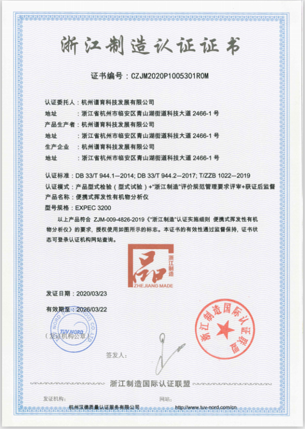2、“浙江制造”標準 T-ZZM1022—2019《便攜式揮發性有機物分析儀》、ZJM-009-4826-2019《便攜式揮發性有機物分析儀(認證實施細則)》