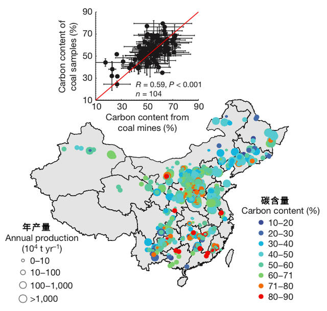 中國煤(mei)炭產(chan)量和煤(mei)的(de)碳含量。可見中國的(de)煤(mei)含碳量總(zong)體偏低。
