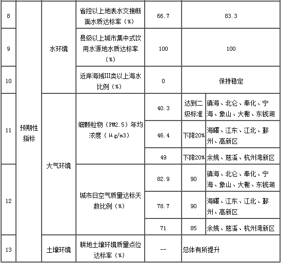 六是生態環境保護。主要包括創建國家生態文明建設示范市、實施重點區域生態保護、優化城鄉生態格局和提升城鄉環境品質等4個方面,主要工作有:至2020年,全市80%以上縣(市)區創建為國家生態文明建設示范縣(市)區,寧波建成國家生態文明建設示范市。實施四明山區域、“一港兩灣”等重點區域、重點河流的生態保護,深入實施森林城市創建等。