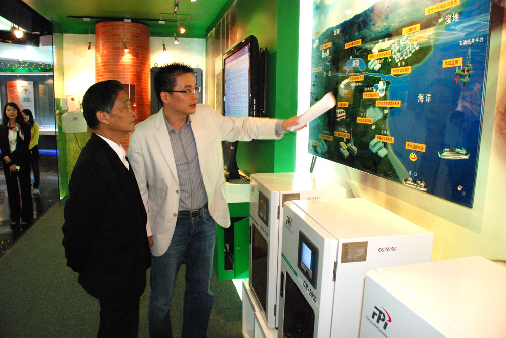 聚光科技(ji)CEO姚納新在公司產品展(zhan)廳(ting)為來(lai)訪的全國政協(xie)委(wei)員(yuan)林(lin)兆樞介紹聚光的環保解(jie)決方案。