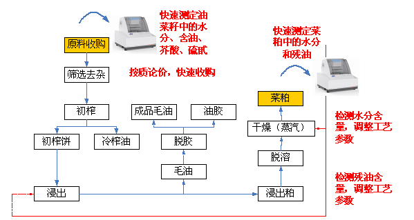 菜籽油生產(chan)工藝流程(冷榨-浸出法)及近紅外應用點: