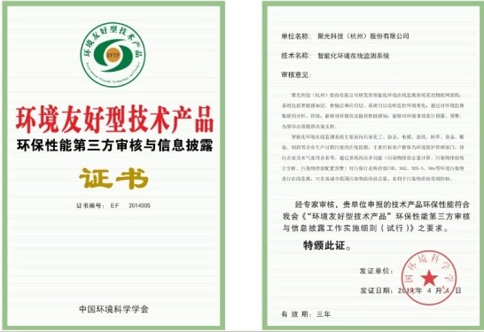 聚光科技(杭州)股份有限公司申報的“智能化環境在線監測系統”經專家委評審,獲得由中國環境科學學會授予的“環境友好型技術產品”榮譽。
