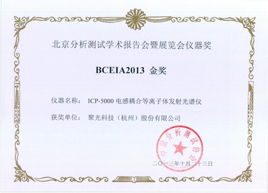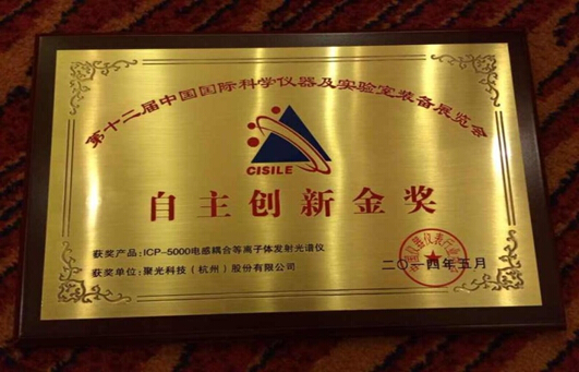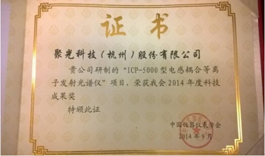 ICP-5000在(zai)2013年(nian)5月(yue)(yue)14日舉辦(ban)的(de)中國(guo)分析測(ce)試(shi)協會(hui)(hui)的(de)專家鑒定會(hui)(hui)上(shang),得(de)(de)到了專家們的(de)一(yi)致認可(ke),均稱(cheng)贊此產(chan)品已經達(da)到國(guo)際同類產(chan)品先進(jin)水平,在(zai)2013年(nian)10月(yue)(yue)舉辦(ban)的(de)BECIA展(zhan)(zhan)會(hui)(hui)和2014年(nian)5月(yue)(yue)舉辦(ban)的(de)CISILE展(zhan)(zhan)會(hui)(hui)均得(de)(de)到金獎(jiang),在(zai)2014年(nian)9月(yue)(yue)MICONEX展(zhan)(zhan)會(hui)(hui)上(shang),獲得(de)(de)科(ke)技成果獎(jiang);