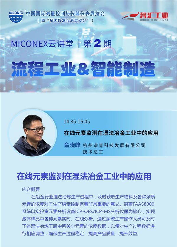 聚光(guang)科技旗下子公司杭(hang)州(zhou)譜(pu)育科技發展有(you)限公司(以下簡稱:譜(pu)育科技)技術總工(gong)俞曉(xiao)峰和解(jie)決方(fang)案團隊應邀參加MICONEX云講(jiang)堂第2期(qi)《流(liu)程工(gong)業(ye)&智能(neng)智造》,將圍繞《在(zai)線元素(su)監(jian)測在(zai)濕法冶(ye)金(jin)工(gong)業(ye)中的應用》開展主題報告(gao),在(zai)線幫助(zhu)流(liu)程行業(ye)解(jie)決“數據實(shi)時性(xing)(xing)差、樣品(pin)代表性(xing)(xing)差”等難題,實(shi)現(xian)“生產(chan)工(gong)藝優化,產(chan)品(pin)品(pin)質提升(sheng)”,滿(man)(man)滿(man)(man)干貨。