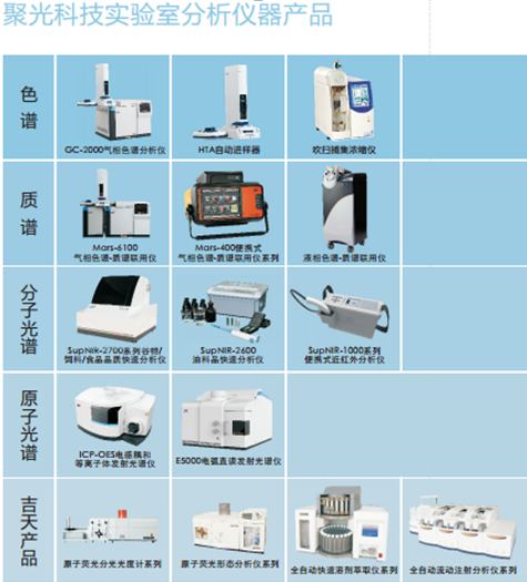 聚光科技(杭州)股份有限公司在實驗室儀器市場經過多年戰略布局,目前已成功推出便攜式GC-MS、氣質聯用儀、氣相色譜儀、電感耦合等離子體發射光譜儀、近紅外光譜儀等在內的分析儀器;通過并購北京吉天儀器有限公司,擴充了無機分析儀器組合以及前處理儀器;通過與LUMEX的合作,補充了原子吸收,測汞儀和熒光測油儀等產品,成為了包括色譜、質譜、光譜、應急檢測以及前處理設備等在內的全方位解決方案供應商;