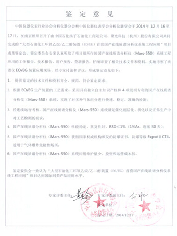 鑒(jian)定委員會專家(jia)在(zai)認真聽取了項(xiang)目組(zu)所作(zuo)的國(guo)產在(zai)線質譜分析儀(yi)(Mars-550)系統(tong)(tong)工(gong)程應(ying)(ying)用的工(gong)作(zuo)報(bao)(bao)(bao)告、技術報(bao)(bao)(bao)告、用戶報(bao)(bao)(bao)告、查(cha)新報(bao)(bao)(bao)告,仔(zi)細審查(cha)了相(xiang)關技術文件(jian)和(he)資料(liao),實(shi)地考察了質譜儀(yi)EO/EG裝置應(ying)(ying)用現場后,經討論和(he)評議(yi),一致認為“大型石(shi)油(you)化工(gong)環氧乙烷/乙二醇裝置(EO/EG)首(shou)套國(guo)產在(zai)線質譜分析儀(yi)系統(tong)(tong)工(gong)程應(ying)(ying)用”項(xiang)目達(da)到國(guo)際同類(lei)產品應(ying)(ying)用水平,通過成果鑒(jian)定。