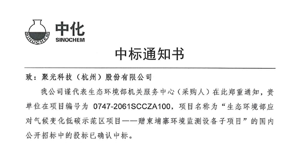 近日,聚光科技(杭州)股份有限公司(以下簡稱:聚光科技)成功中標“生態環境部應對氣候變化低碳示范區項目——贈柬埔寨環境監測設備子項目”。此次中標項目包括但不限于提供大氣環境質量監測設備10套的生產供貨、物資檢驗和出口報關、境內外運輸、保險、包裝、境內外技術指導培訓、宣傳和保障服務等。