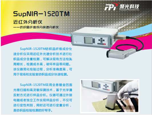 聚光科技在無機檢測、有機檢測、近紅外檢測和環境應急檢測等實驗室分析領域擁有眾多成熟的應用和解決方案,本次攜國內首臺全譜直讀ICP-5000和近紅外系列產品參會,其中聚光科技參與制定的紡織品纖維組分近紅外檢測方法標準,便是采用的SupNIR-1500系列便攜式近紅外分析儀,該產品已經對外檢測100000余批次紡織品。“紡織品 纖維定量分析 近紅外光譜法”獲工信部標準立項,項目號:2013-1732T-FZ,該項目獲得“中國紡織工業聯合會科學技術進步二等獎”。