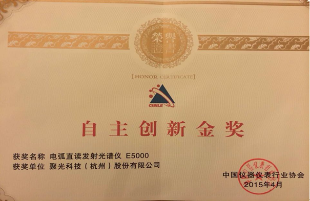 CISILE沿襲了多年來鼓勵自主創新、積極推動國產科學儀器技術進步的辦展理念,“CISILE 2015自主創新獎評選活動”如期舉行,經過業內專家學者組成的評審團歷時預審、集中評審和現場評審的層層嚴格評選,獲獎結果于23日在自主創新獎頒獎儀式及聯誼會上隆重揭曉。走“中國創造、自主創新“之路的聚光科技承襲去年囊括金獎半壁江山的好成績,再次斬獲兩項金獎,其中由聚光科技(杭州)股份有限公司申報的“電弧直讀發射光譜儀E5000”和聚光下屬全資子公司北京吉天儀器有限公司申報的”直接進樣汞鎘測定儀DCMA-200“雙雙獲得”自主創新金獎產品“。