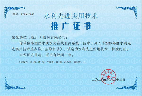 之前(qian),水(shui)利(li)部根據《水(shui)利(li)先(xian)進實用技(ji)(ji)(ji)術(shu)(shu)重(zhong)點推(tui)(tui)廣(guang)指(zhi)(zhi)導目(mu)錄管理辦法》,結合水(shui)利(li)工作(zuo)(zuo)實際技(ji)(ji)(ji)術(shu)(shu)需求,組織開展了《2020年水(shui)利(li)先(xian)進實用技(ji)(ji)(ji)術(shu)(shu)重(zhong)點推(tui)(tui)廣(guang)指(zhi)(zhi)導目(mu)錄》的評審工作(zuo)(zuo)。聚光科技(ji)(ji)(ji)“小型站水(shui)質水(shui)文(wen)在線監(jian)測系(xi)統(tong)”作(zuo)(zuo)為水(shui)質水(shui)文(wen)監(jian)測優秀技(ji)(ji)(ji)術(shu)(shu)成果被列入《2020年度水(shui)利(li)先(xian)進實用技(ji)(ji)(ji)術(shu)(shu)重(zhong)點推(tui)(tui)廣(guang)指(zhi)(zhi)導目(mu)錄》,并獲得(de)水(shui)利(li)部科技(ji)(ji)(ji)推(tui)(tui)廣(guang)中心(xin)頒發的《水(shui)利(li)先(xian)進實用技(ji)(ji)(ji)術(shu)(shu)推(tui)(tui)廣(guang)證(zheng)書(shu)》。