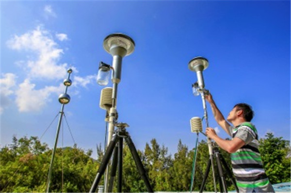 工作人員在(zai)三亞(ya)亞(ya)龍灣空氣(qi)自動(dong)監測站檢查設(she)備