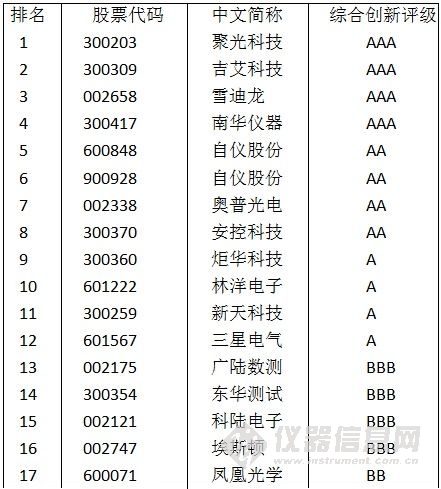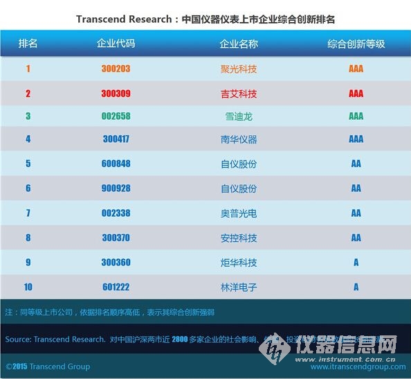 近(jin)日,根據超驗(Transcend Group)旗下超驗創(chuang)新(xin)研究院的大數據中國(guo)企業最新(xin)研究表明(ming),在儀(yi)器(qi)儀(yi)表上(shang)市企業綜合(he)創(chuang)新(xin)排(pai)名中,聚(ju)光科技(ji)綜合(he)創(chuang)新(xin)評級為AAA,位居第一(yi)。
