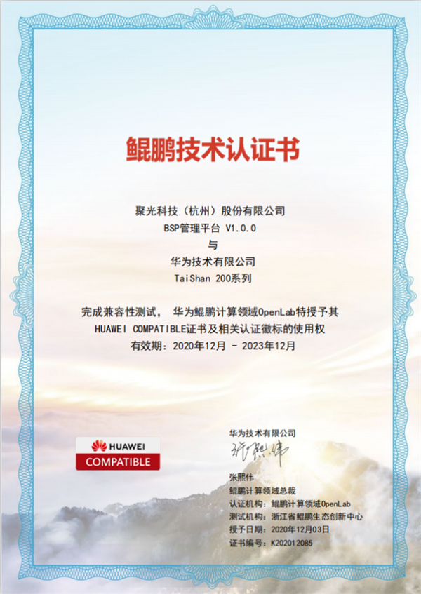 近日(ri),聚(ju)光(guang)科技(杭州)股份有限公司(以下簡稱:聚(ju)光(guang)科技)BSP管理平臺(tai)等(deng)多(duo)款產(chan)品與華為鯤鵬服務順利完成(cheng)兼容性測試認證,這(zhe)標志著聚(ju)光(guang)科技國產(chan)化設備的技術匹配能力邁出了(le)一大步(bu)!