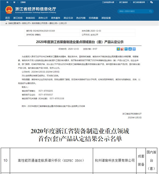 聚光科技旗下全資孵化子公司杭州譜育科技發展有限公司(簡稱:譜育科技)高性能雙通道走航質譜分析儀(EXPEC3500)被認定為國內首臺(套)產品。