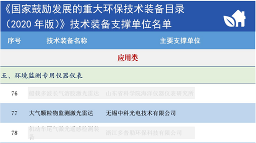聚光科技旗下子公司無錫中科光電的大氣顆粒物激光雷達成為唯一入選“應用類技術裝備”的大氣顆粒物監測類設備。