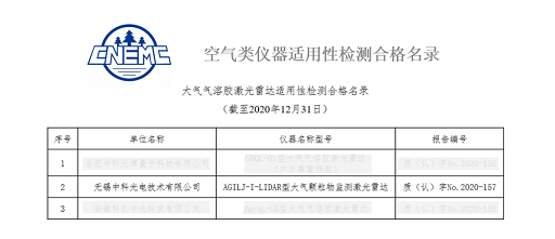 日前,環境監測(ce)總站發(fa)布了《空氣(qi)類(lei)儀(yi)器適用性檢測(ce)合格(ge)名錄(截至2020年12月31日)》,中科光電的大氣(qi)顆粒物監測(ce)激光雷達以其優(you)越的性能、廣泛(fan)的應用和良好的發(fa)展前景入選(xuan)名錄。