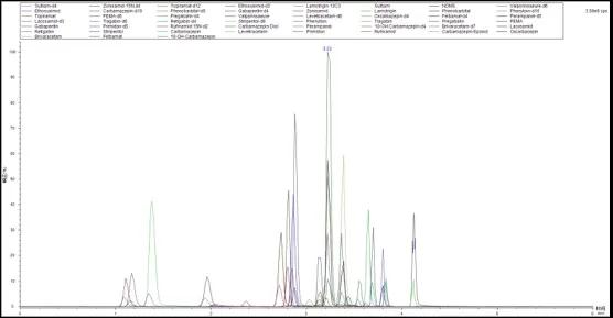 EXPEC 5210 可通過質譜離子源正負離子切換,實現一針進樣,6分鐘內完成27種精神類藥物濃度監測,結果穩定、準確,滿足臨床高通量檢測需求。