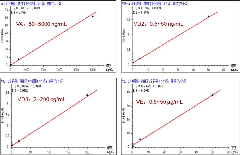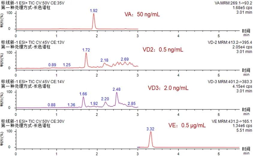 EXPEC 5210 針(zhen)對維生(sheng)素ADE的檢(jian)(jian)測(ce)采(cai)用梯度洗脫條件,在縮短分析時(shi)間(jian)的同時(shi)獲得了較好的去介質(zhi)及分離(li)效果,一針(zhen)進樣(yang)可得到VA、25-OH-VD2、25-OH-VD3、VE檢(jian)(jian)測(ce)結果,滿足(zu)臨床(chuang)的高通量(liang)需求。同時(shi)在前處理過(guo)程(cheng)中添加同位素內標后,消除了不(bu)同基質(zhi)樣(yang)本中內源性物質(zhi)對檢(jian)(jian)測(ce)物的影響,大大提高了檢(jian)(jian)測(ce)結果的準確性。