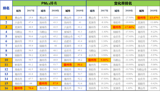 宿州(zhou)市(shi)2017年-2019年PM2.5濃(nong)度及變化率省內排名情(qing)況(kuang):