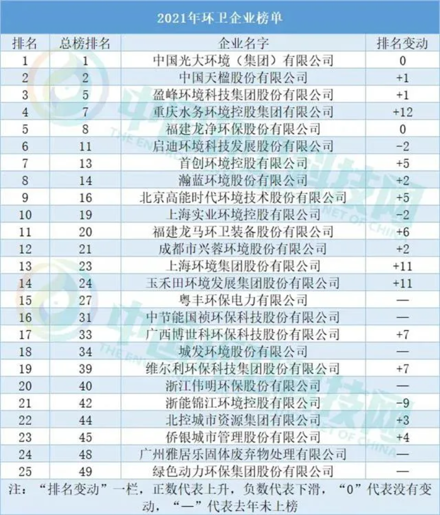 環(huan)(huan)衛(wei)(wei)25強(qiang)企業(ye)中(zhong),有(you)20強(qiang)與垃(la)圾末(mo)端處置有(you)關,其中(zhong)又以垃(la)圾焚(fen)燒為主。純(chun)環(huan)(huan)衛(wei)(wei)服務(wu)(wu)企業(ye)則有(you)兩(liang)家,分別為玉(yu)禾田和(he)僑銀股份,兩(liang)者排名(ming)均有(you)大幅上(shang)升(sheng);而同時涉足環(huan)(huan)衛(wei)(wei)裝備、環(huan)(huan)衛(wei)(wei)服務(wu)(wu)的企業(ye)也(ye)有(you)兩(liang)家,分別為盈峰(feng)環(huan)(huan)境(jing)和(he)龍(long)馬環(huan)(huan)衛(wei)(wei),前者上(shang)升(sheng)1位高(gao)居第五(wu),后(hou)者上(shang)升(sheng)幅度達6位;粵豐環(huan)(huan)保(bao)、國禎環(huan)(huan)保(bao)、城發環(huan)(huan)境(jing)、偉明環(huan)(huan)保(bao)、雅居樂固廢、綠色(se)動力六企業(ye)則是首次入圍50強(qiang)。
