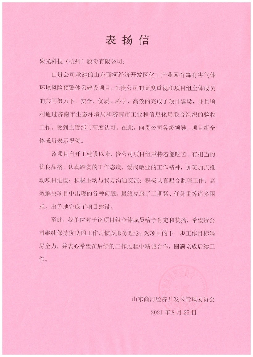 山東(dong)商河經濟開發區管理委員(yuan)會(hui)表揚(yang)信