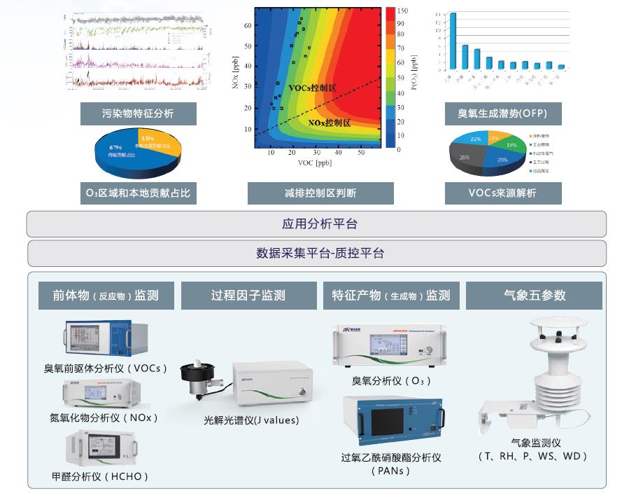 聚光科技光化學污染綜合監測解決方案通過構建大氣光化學污染監測網,配套在線光化學前體物、光解速率和特征產物等核心監測設備,對臭氧污染進行全面監測,結合綜合數據分析平臺,對區域和本地貢獻進行識別、臭氧污染控制區判斷和VOCs來源解析,通過對O?和VOCs進行精細化管控,實現空氣質量的持續改善。