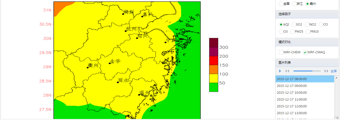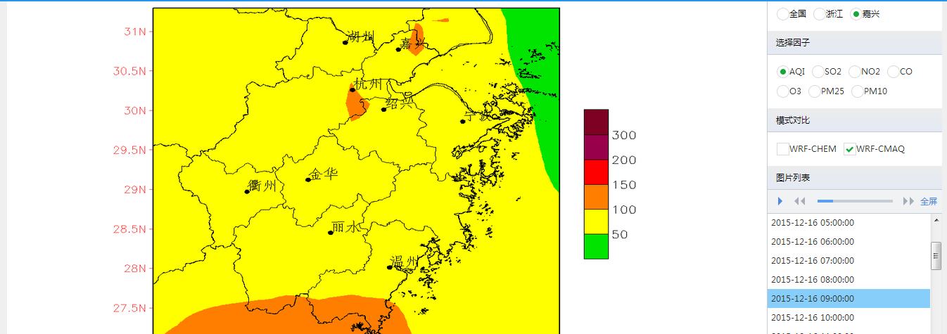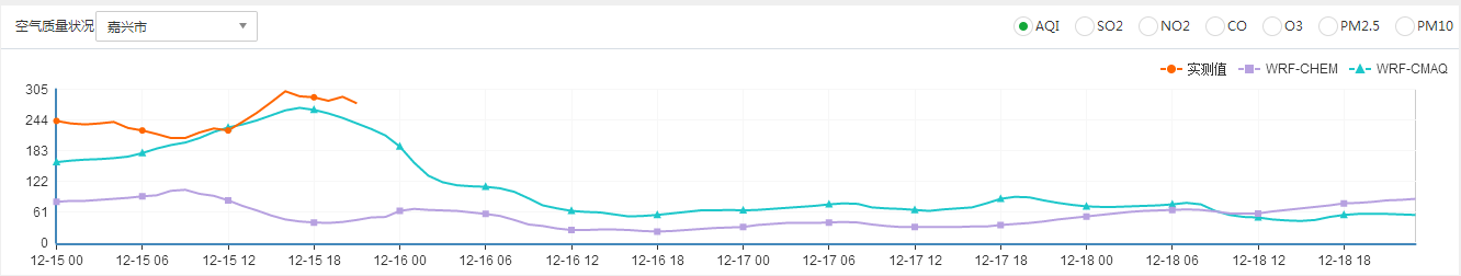 12月15日全天,烏鎮被重度污染籠罩,在15日下午5點左右,空氣污染達到污染峰值。根據未來幾天5-6級西北風氣象條件及與顆粒物之間的關系模型分析,聚光科技預測,嘉興區域的灰霾天氣將于16日凌晨3時左右平緩減弱。16日早上9時左右,空氣質量明顯好轉,平穩處于“良”的等級。