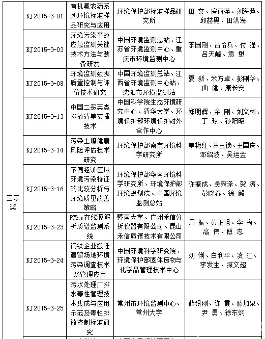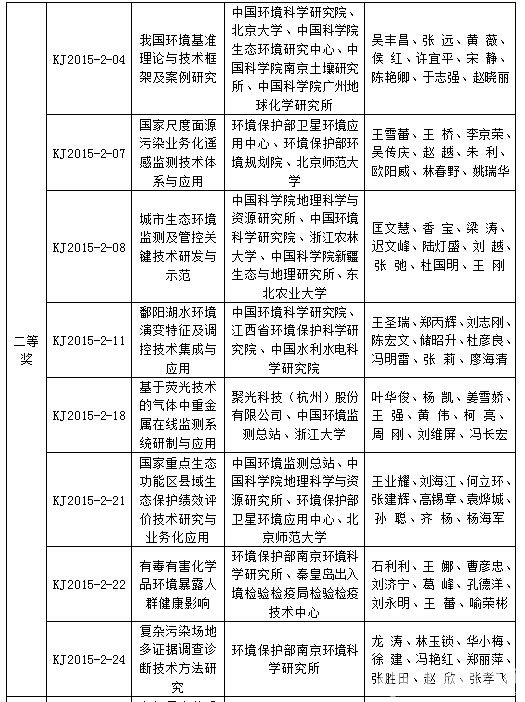 涉及儀器和監測類的項目共20項,其中一等獎1項,二等獎8項,三等獎11項,由聚光科技(杭州)股份有限公司,中國環境監測總站、浙江大學牽頭參與的項目《基于熒光技術的氣體中重金屬在線監測系統的研制與應用》獲2015年度環境保護科學技術二等獎,目錄如下: