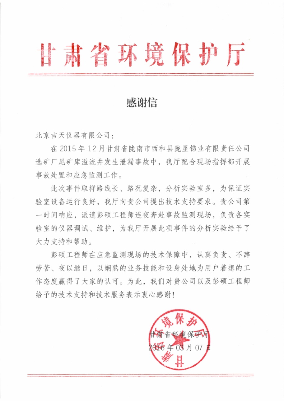 由于事發突然,且事發地點地貌環境復雜多變,采樣、檢測、分析工作量陡增,這對當地環監站的應急能力形成極大的考驗。吉天作為檢測儀器供應商,在第一時間對此事件做出響應,積極配合當地環監系統開展應急檢測工作,為前線儀器的正常運轉提供了有力的技術保障。其中,來自吉天的工程師彭碩在整個事件中表現尤為突出,面對艱難險阻不辭辛苦劈波斬浪,受到“火線”上戰友們的一致認可,為此,甘肅省環境保護廳特發感謝信,感謝吉天公司以及工程師彭碩為應對此次突發事件做出的貢獻。同時吉天公司也對甘肅省環保廳的高度認可表示感謝,更好地為用戶解決問題是我們服務的唯一宗旨!用戶的肯定是我們前進的最強動力!