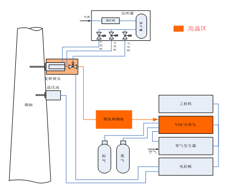 煙氣VOC在線監測系統主要由采樣探頭、伴熱管線、預處理單元、VOCs分析儀、電控單元組成。樣氣經伴熱管線和除塵后通入VOCs分析儀表,全程高溫在120℃及以上;樣氣經色譜分離后,各組分依次進入氫火焰離子化檢測器(FID)或光離子化檢測器(PID)進行測量分析。
